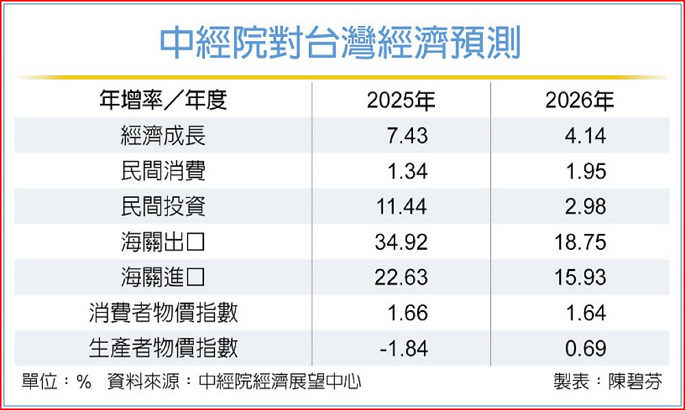 中華經濟研究院董事長曹添旺指出,台灣在科技優勢與強勁出口支撐下,交出亮眼成績。中華經濟研究院19日發布最新經濟預測,今(2026)年經濟成長率4.14%,並上修2025年經濟成長率達到7.43%,兩項數據均高於主計總處,更是國內主要經濟研究機構最高預測值;兩年的CPI年增率分別約為1.64%、1.66%,延續疫後時期來的下降趨勢。
