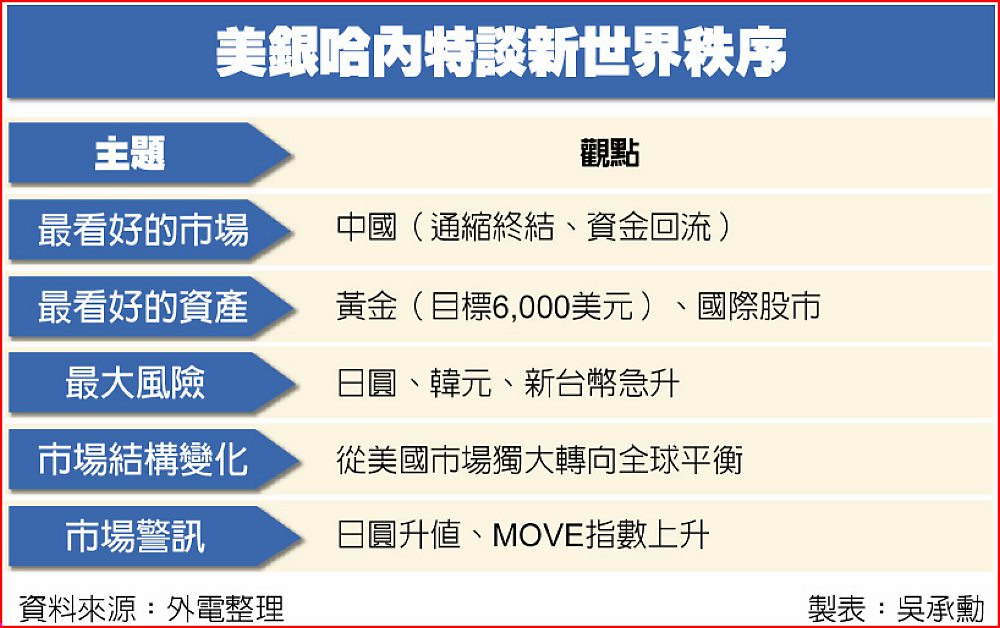 但假如日圓短期內未崩盤,哈內特認為市場則會步入新世界秩序的大環境之中。他指出2020年代,美國股票基金已吸引了1.6兆美元資金,而全球股票基金僅流入0.4兆美元,顯示全球資金高度集中在美國,投資者和機構可能調整配置,將部分資金分散到全球市場,美國市場可能不再獨大,因此建議做多國際股市。