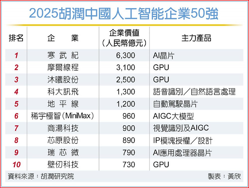 胡潤研究院19日正式公布「2025胡潤中國人工智能企業50強」,聚焦主要業務為AI運算能力或演算法的中國企業。榜單顯示,寒武紀以人民幣(下同)6,300億元估值位居榜首,摩爾線程以3,100億元居次,沐曦則以2,500億元排名第三,凸顯中國AI晶片公司在快速成長的人工智慧市場中,占據領先地位。