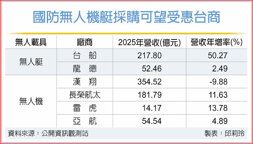 國防部首度籌購無人機、無人艇即將釋單,不僅台廠供應鏈聯手準備競標,美商等外商也陸續訪台希望結盟搶單。國防部19日公開擬籌購七類武器採購數量與規劃,包括20餘萬架各式濱海監偵型、攻擊型無人機,及1,000餘艘無人艇;海軍網上公開徵求「攻擊無人艇」等4項裝備廠商意見,也在19日截止,台船、龍德等業者均提供資料,表態將參與競標。