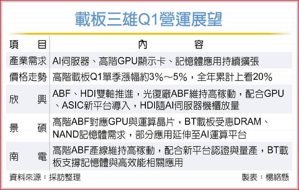 受惠AI及高效能運算(HPC)應用規格升級,高階載板需求與價格調整效應同步發酵。在T-Glass玻纖布價格上調與AI相關載板出貨放量支撐下,法人預期,載板三雄欣興(3037)、景碩(3189)與南電(8046)2026年首季營運可望呈現淡季不淡走勢,並隨產品組合調整與產能布局進度推進,支撐全年動能穩步展開。