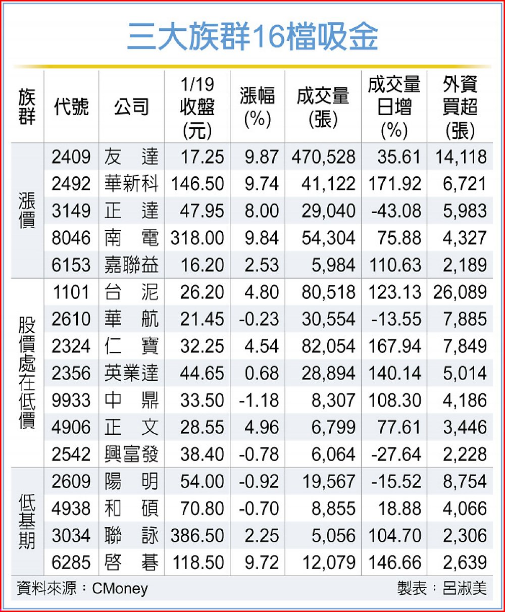 台股挾產品漲價、股價處在低價及低基期等三大題材,呈現AI科技股及各產業龍頭指標股等多點開花,進一步篩選外資19日逆勢加碼2,000張以上的個股有友達(2409)、台泥(1101)及陽明(2609)等16檔。
