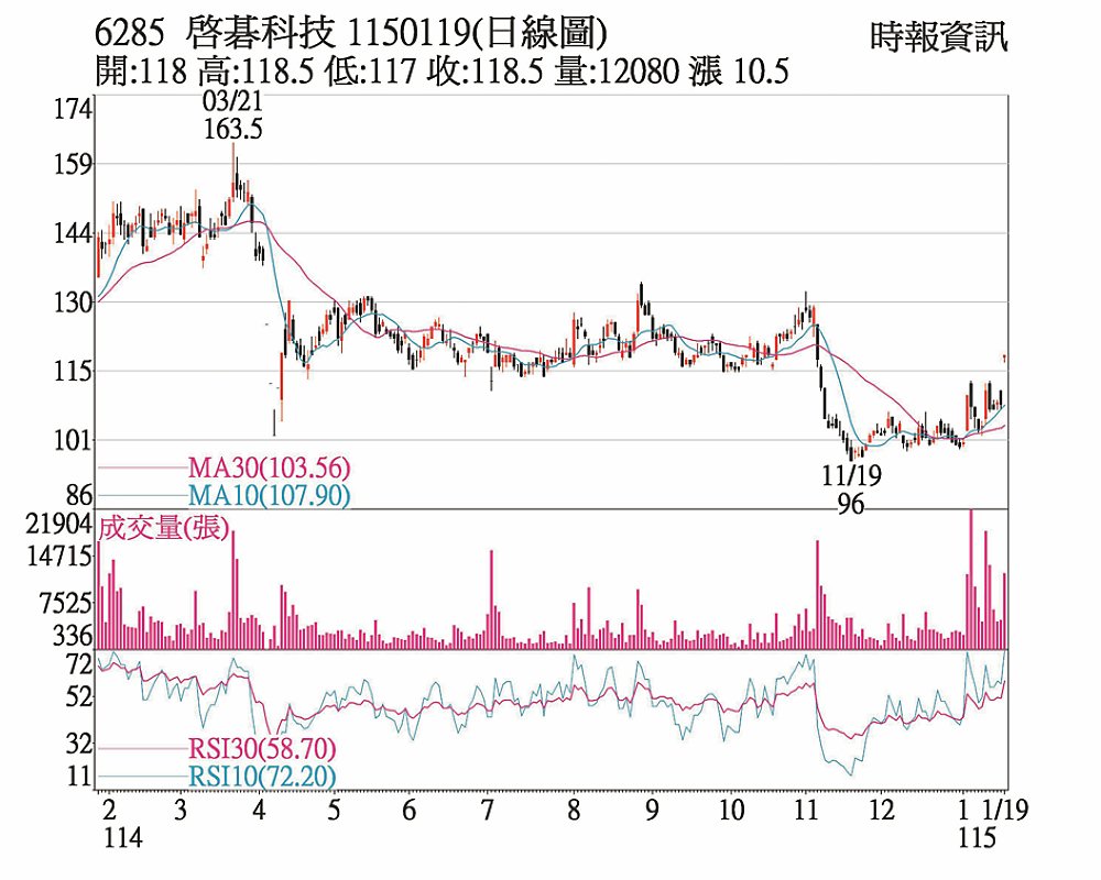 網通股啟碁(6285)今年營運表現受市場看好,資金進場卡位,推升19日股價以漲停板118.5元收市,走勢強攻衝高後,一口氣越過5日、10日、季線及半年線關卡,目前技術指標日KD及周KD同步呈現交叉向上,同時,先前股價震盪時,內外資法人同步調節,19日外資反手買超,單日買超2,639張,為近二個月以來單日最大買超張數,有利後市股價表現。