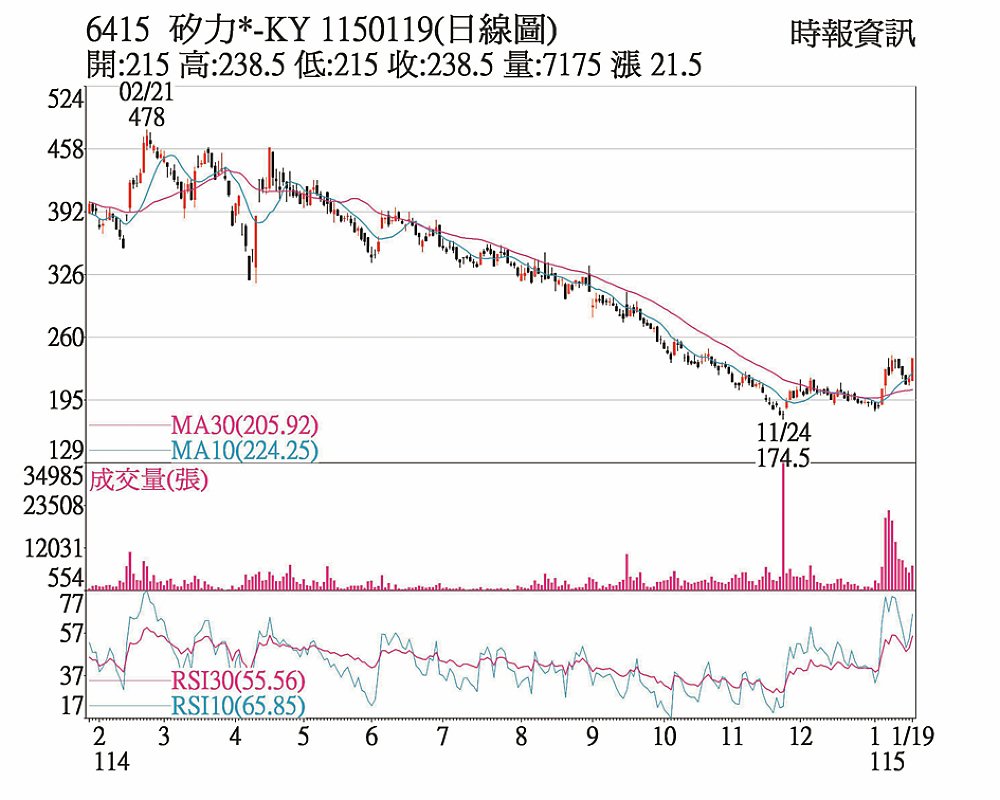 矽力19日股價終場強鎖漲停,收238.5元,均線呈現谷底翻揚態勢,短期均線翻轉向上,往半年線248元壓力區挑戰;投信法人近一個月以來站買方,成交量能亦顯著放大。展望2026,受惠中國大陸電動車客戶群持續擴大、滲透率提升,以及新車用電源管理產品陸續放量。