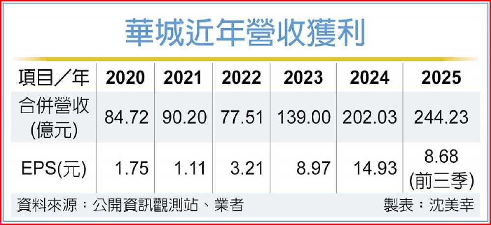 華城(1519)近期股價飆漲,遭證交所列為警示股,19日公布自結2025年12月稅後純益7.6億元,每股稅後純益(EPS)達2.41元,加計2025年前三季EPS為8.68元,累計EPS至少11.09元,全年EPS有機會挑戰2024年締造的14.93元歷史新高。
