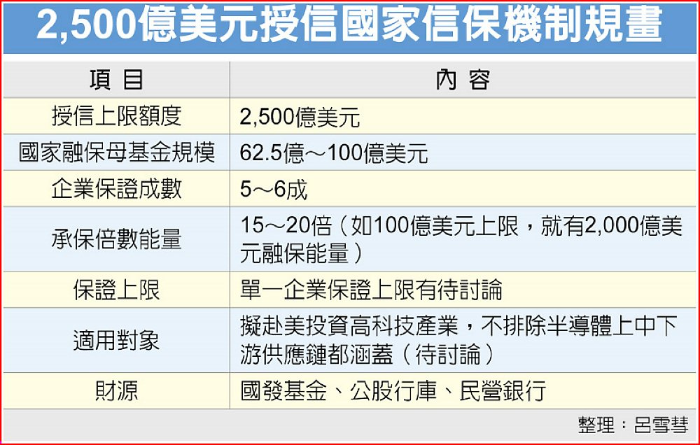 行政院副院長鄭麗君20日首度揭露,政府提供企業赴美投資的授信上限2,500億美元,初步規劃政府擬匡列台美專款規模約62.5億~100億美元,將分五期編列建立,對高科技企業提供信用保證成數約5~6成,基金承保的保證倍數則為15~20倍,資金來源由國發基金籌措,並號召公民營行庫共同參與。