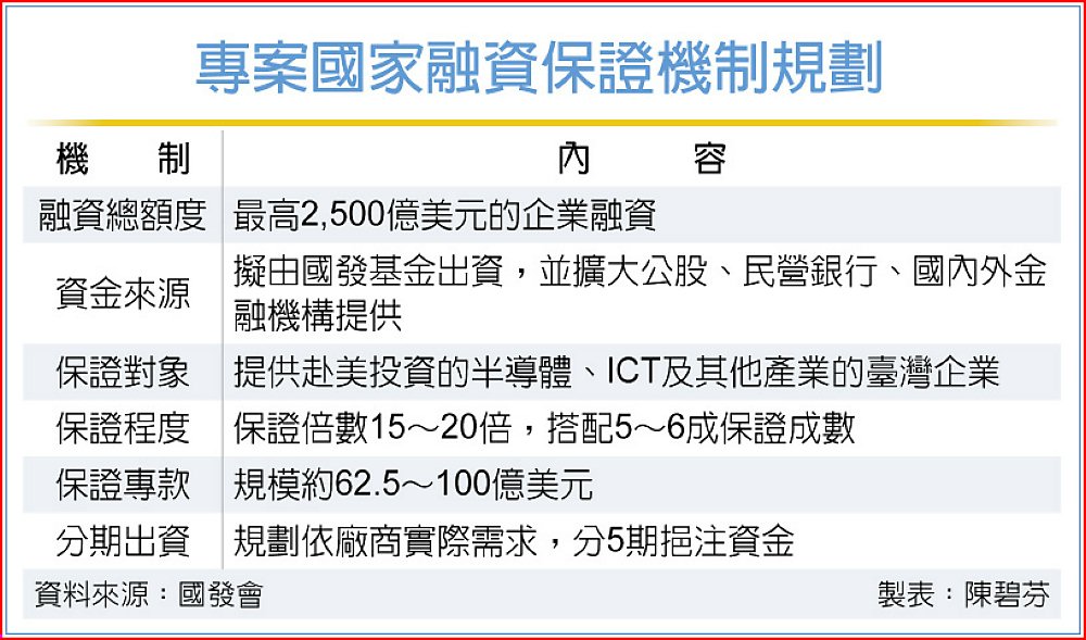 行政院20日上午召開記者會,國發會下午即公布專案信保機制的四大規劃,包括:一、融資總額度:支持金融機構提供最高2,500億美元的企業融資。二、保證對象:提供赴美投資的半導體、ICT及其他產業的台灣企業。行政院顧問認為,高科技行業均為大型企業集團,實際上使用到政府擔保金融的需求可能不大,但中小企業走出台灣,在海外人生地不熟,一旦有企業併購或大訂單等採購資金需求,加了一層的政府信用保證,在海外取得營運資金的成本可以降低。