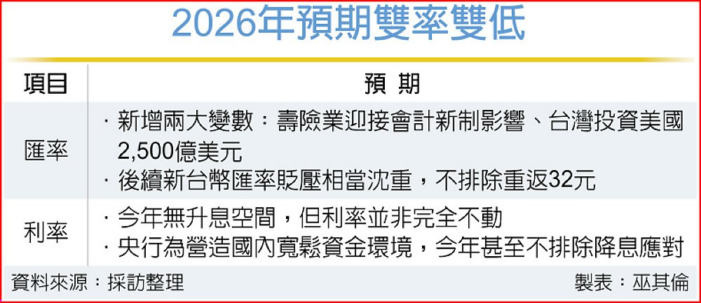 2026年開年以來,新台幣兌美元累計已貶值1.5角。市場解讀,除外資仍在賣股並匯出,更新增壽險業迎接會計新制影響,以及台灣投資美國2,500億美元資金兩大變數,導致貶值壓力沈重,為活絡資金環境,央行今年是否降息以對,成為受矚目的新話題,整體來看,全年「雙率雙低」的機率不低。