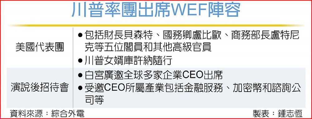 川普預計21日抵達達沃斯,在WEF發表演說後,還會主持一場商界領袖雲集的招待會。