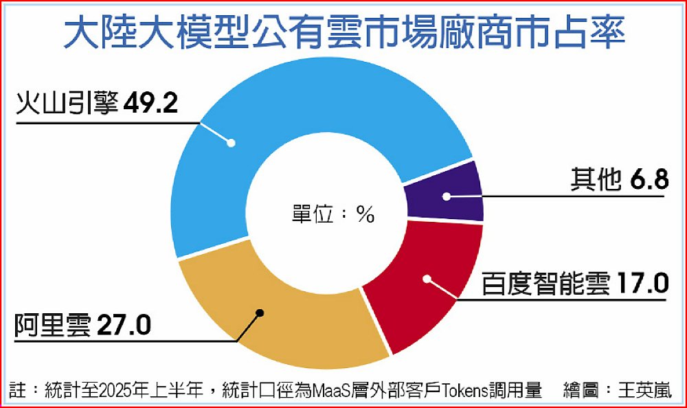 IDC數據顯示,2025年上半年,火山引擎僅次於阿里巴巴,是大陸第二大AI基礎設施及軟體供應商,阿里以23%市占率,在大陸AI雲端服務收入位列第一,字節跳動則以13%市占率位居第二。若以MaaS層外部客戶Tokens調用量(不含廠商自有業務)統計,則期內大陸AI雲市場規模達536.7兆Tokens,火山引擎以49.2%占比登頂,阿里雲以27%居次。
