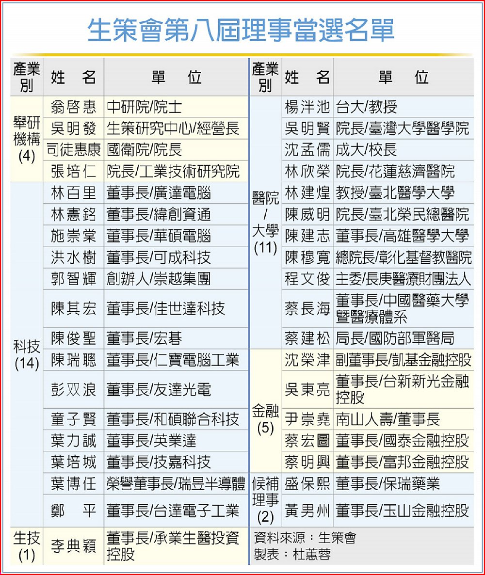 生策會第八屆理事當選名單,整體理事結構橫跨學研、科技、生技、醫療、金融五大領域,其中科技業理事席次擴增至14席,持續成為最大族群,廣達董事長林百里、華碩董事長施崇棠、和碩董事長童子賢、宏碁董事長陳俊聖、緯創董事長林憲銘等重量級科技業領袖續任,並新增仁寶董事長陳瑞聰、英業達董事長葉力誠,凸顯ICT產業對生醫發展的長期布局與話語權。