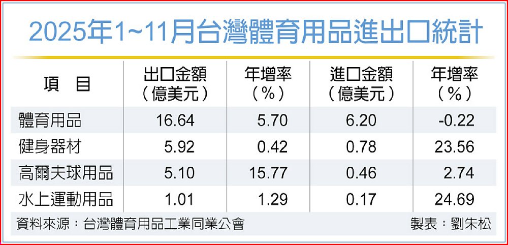 不受關稅之亂衝擊,台灣體育用品出口逆風成長。根據台灣體育用品工業同業公會統計,2025年前11月台灣體育用品出口總額達16.64億美元、年增5.7%,其中美國為最大市場,占比高達51.08%,其次為中國大陸的8.73%與日本的6.3%。出口品項中,以健身器材5.92億美元、年增0.42%為最大宗,占整體出口值的35.59%,市場集中在美國(占59.6%)。