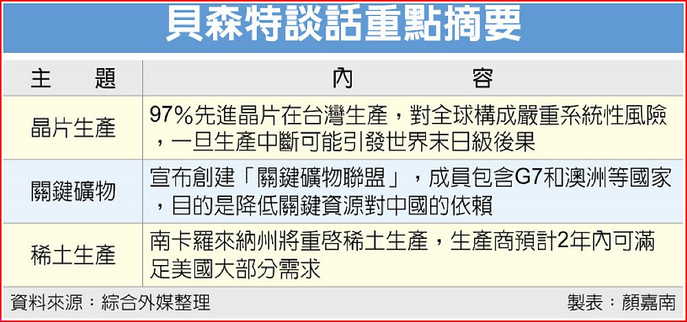 貝森特20日在瑞士達沃斯世界經濟論壇(WEF)表示:「97%的高階晶片在台灣生產,對全球經濟形成最大的單一威脅,和最大的單點故障。」他並提出警告,若台灣的產能遭封鎖或摧毀,任何生產中斷將造成「末日級」的經濟後果。
