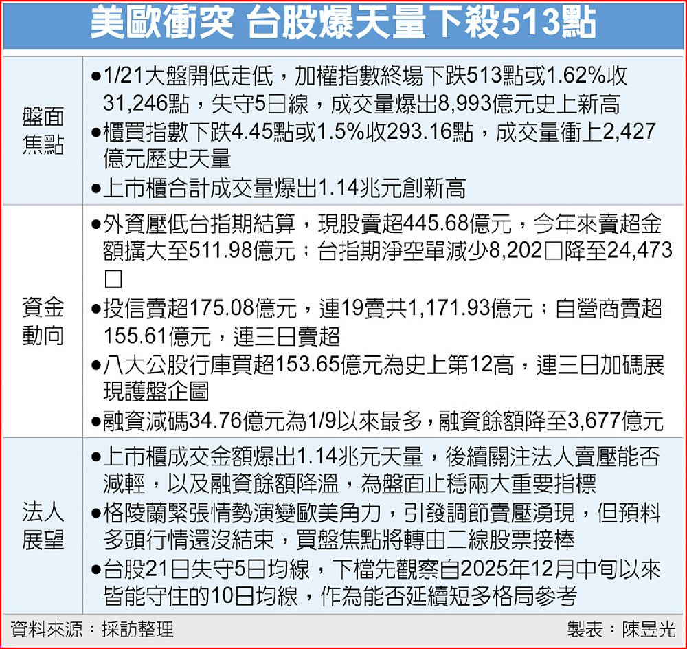 台股自2026年來持續墊高,最多漲幅達1成,漲多成最大利空,格陵蘭事件致避險情緒大升,調節賣壓湧現,上市櫃兩市場21日雙爆天量走跌,合計成交達1.14兆元,台積電、鴻海等大型權值股普遍回檔,上市市值蒸發1.68兆元。