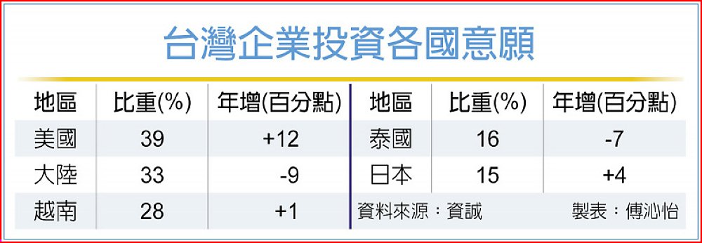 值得注意的是,台灣企業對印度和菲律賓投資意向也較去年增加,主要是基於供應鏈風險分散與巨大人口紅利,想投資印度的台灣企業增加5個百分點;美國、日本「呂宋經濟走廊」則驅動對菲律賓投資意願增加4個百分點。