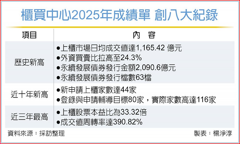 櫃買中心董事長簡立忠表示,櫃買市場2025年股債表現優異,據世界交易所聯合會(WFE)統計,2025年底櫃買中心股票成交值周轉率穩居全球第二名,債券ETF掛牌檔數達95檔,發行規模近3兆元,於亞太地區主要證券交易所中排名第一,全球排名第七,顯示櫃買中心「股債雙核心」已躋身國際前列。