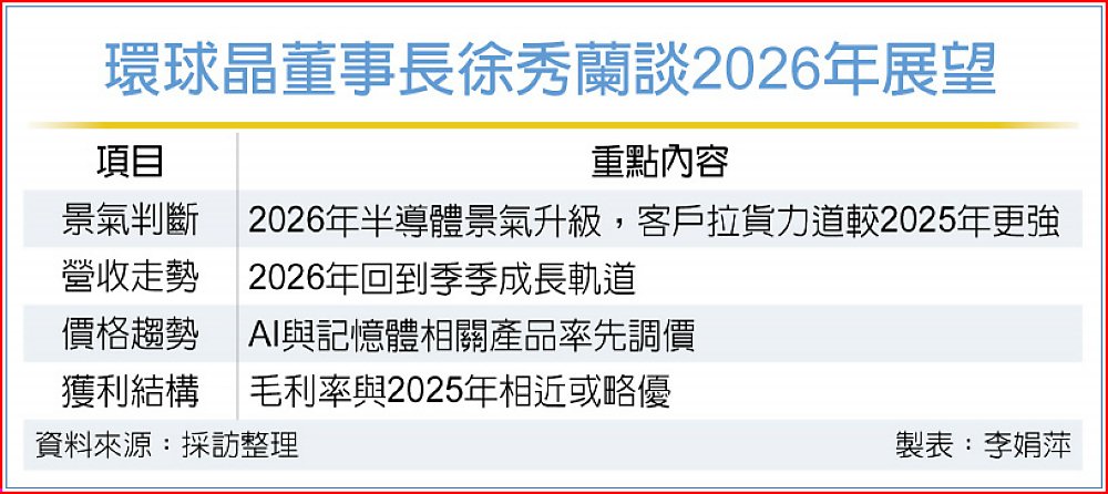 徐秀蘭21日與媒體茶敘時表示,她預期,環球晶2026年營運將回到「季季走高」的成長軌道,價格調整也將從AI應用及記憶體相關產品率先啟動,成為新一輪景氣循環的重要指標。