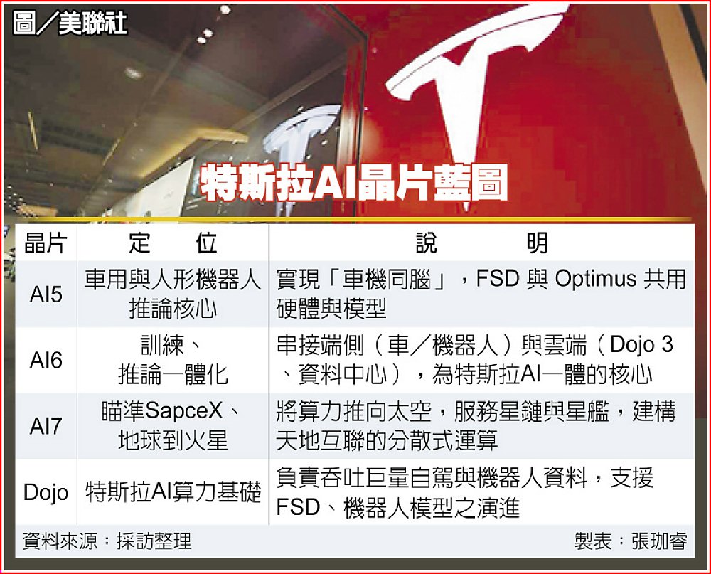 全球AI競賽全面升溫,特斯拉執行長馬斯克再丟震撼彈,從自研AI5、AI6一路鋪陳到AI7與Dojo 3超級電腦重啟,甚至評估自建晶圓廠,企圖以「九個月一代」的極限節奏,重塑AI硬體競爭規則。這不僅是特斯拉自身戰略升級,也牽動全球半導體供應鏈重新站位;其中,創意打入AI5後段設計服務,供應鏈透露將於本季流片(Tape-out),未來Dojo 3是否再以SoW(系統級晶圓)方式進行,也考驗其先進封裝之設計能力。
