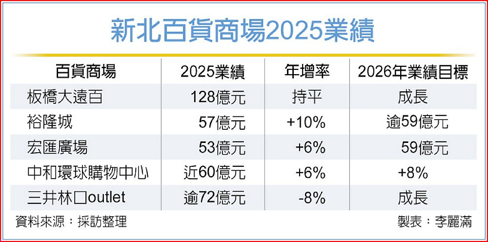 新北市百貨店王-板橋大遠百,2025年在國際精名品持續改裝到位及引進新餐飲品牌挹注下,全年業績(含稅)達128億元,續創新高;板橋遠百中山店則有新櫃位挹注,2025年業績逆勢成長2%,來到近30億元。