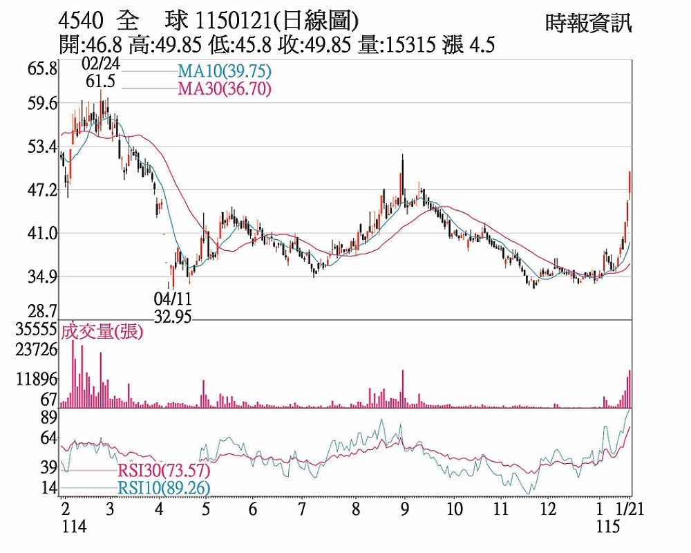全球傳動(4540)布局人形機器人產業,來自半導體產業訂單也續增,2026年營收拚二位數成長、轉虧為盈。外資21日賣出402張,自營商買進140張,合計賣超262張,承接買盤強勁,開盤33分鐘亮燈漲停49.85元鎖死,終場大漲4.50元。