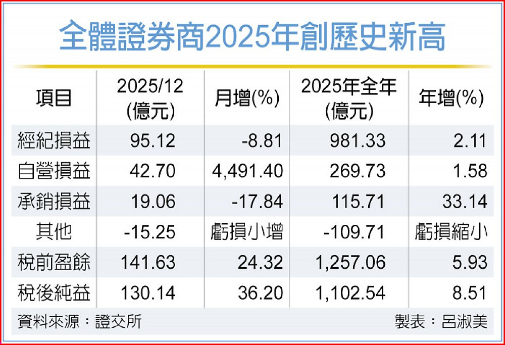 臺灣證券交易所統計,全體證券商2025年12月稅後純益130.14億元、月增36%,累計全年稅後純益1,102.54億元,年增逾8%,連續兩年獲利衝破千億元,並刷新高,一舉改寫2021年的1,054.27億元歷史新紀錄。