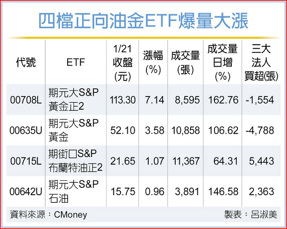 美歐因格陵蘭島主權引發的紛爭愈演愈烈,避險資產的黃金價格飆升,在台股交易的期元大S&P黃金(00635)及期元大S&P黃金正2(00708L)兩檔ETF,21日各飆漲3.58%及7.14%,雙刷新高;另期街口S&P布蘭特油正2(00715L)期元大S&P石油(00642U)也各爆量約上漲1%。