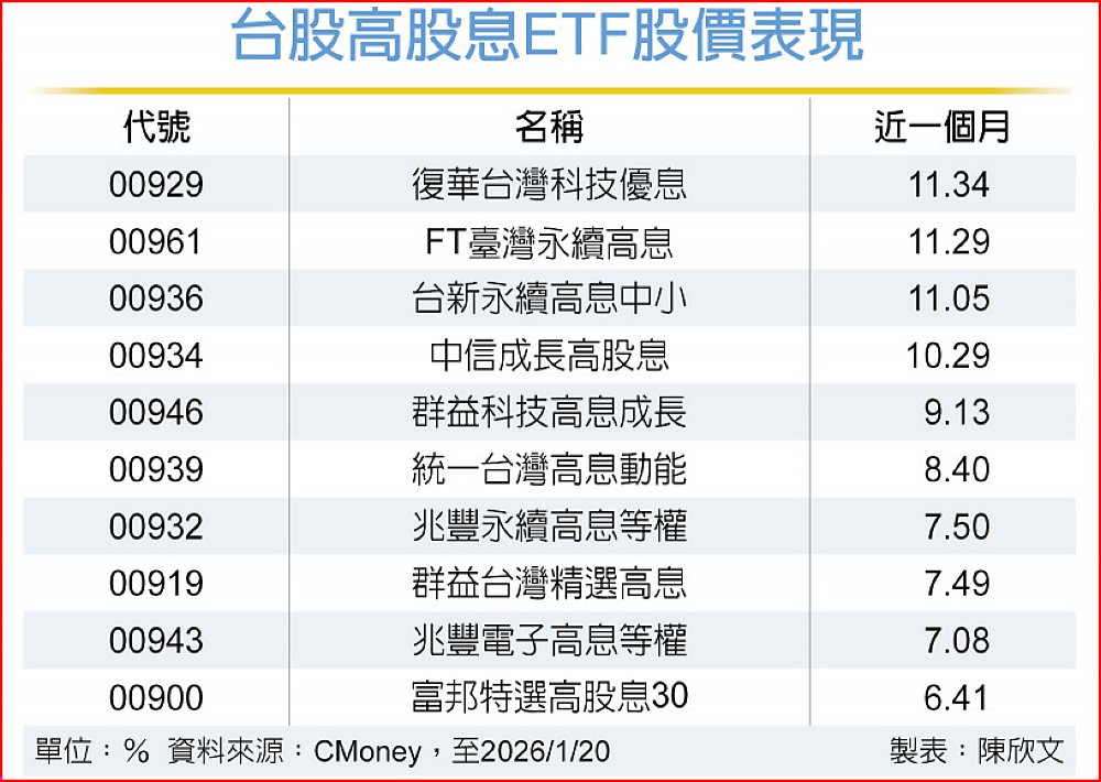 其中近1月股價漲幅逾1成共有4檔,包括復華台灣科技優息(00929)、FT臺灣永續高息(00961)、台新永續高息中小(00936)、中信成長高股息(00934),優於臺灣高股息指數同期間漲幅約5%,表現亦不輸市值型ETF,主要在於成份股納入記憶體、半導體、IC設計及電腦周邊設備等熱門AI供應鏈受惠題材,其中00929更納入台積電,創規模逾千億高股息ETF首例。