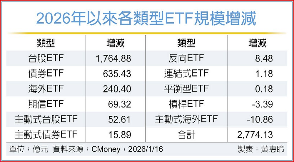 根據CMoney統計,截至1月16日止,年初以來國內 ETF整體規模合計又增加2,774億元,資金明顯集中於台股ETF與債券ETF兩大類型,占整體規模成長比重近九成。