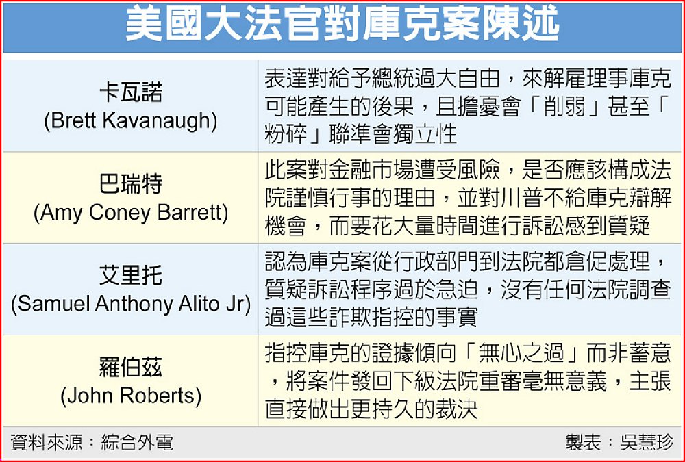 最高法院聽取庫克案的言詞辯論,大法官不分保守派和自由派,都尖銳質詢代表川普政府的辯護律師索爾。川普親自任命的大法官卡瓦諾也說,總統欲將庫克解職的立場,就算不到「粉碎」地步,也會「削弱」聯準會獨立性。