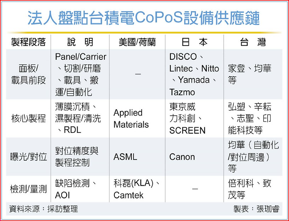 設備業者透露,嘉義AP7將為CoPoS量產核心基地,而客戶已將規格開出,如面板尺寸、材料(玻璃/藍寶石)等細節。AP7規畫不僅是單一廠區,而是高度集中的封裝聚落,CoPoS首波供應鏈包含科磊(KLA)、東京威力科創(TEL),乆以及應用材料等大廠;台廠據傳也有13家業者入列。