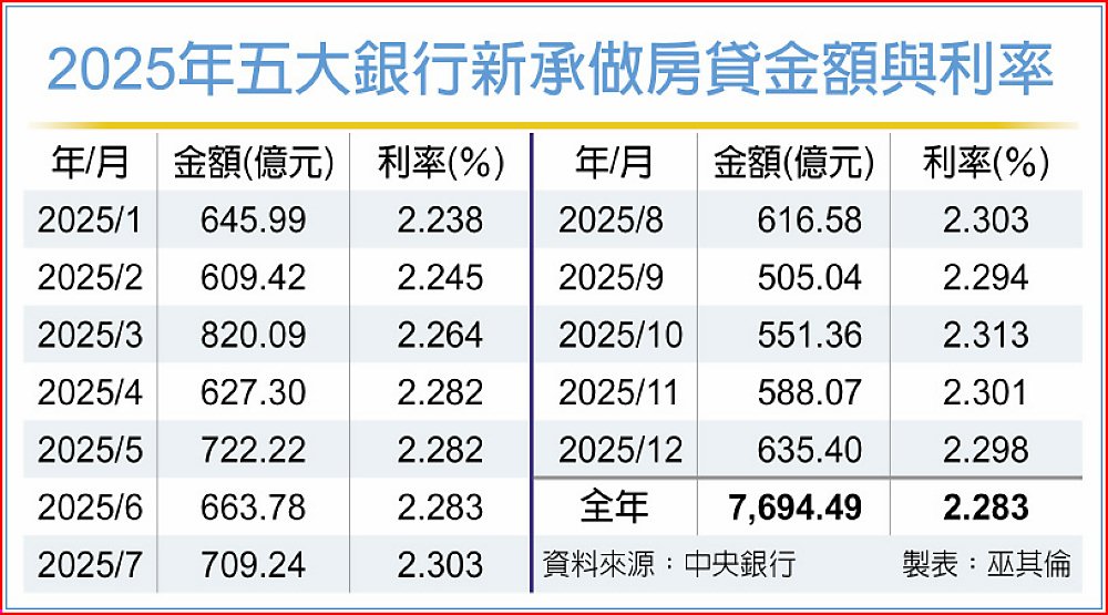 央行經研處副處長葉盛指出,2025年12月五大銀行新增房貸金額635.4億元、年增47.33億元,利率小幅降至2.298%,主因公教築巢優利貸比重增加,使單月利率下行;全年新增房貸僅7,694.49億元,利率為2.283%,創2009年以來17年新高水準。