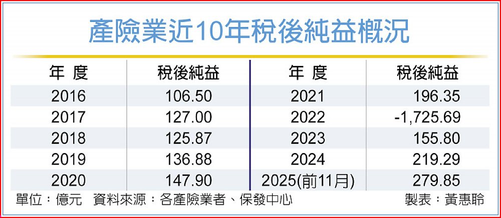 歷經防疫險理賠高峰的劇烈衝擊後,產險業近二年整體獲利表現明顯回穩並持續走升。根據產險業資料、保險事業發展中心統計,2025年前11月產險業稅後純益已達約280億元,不僅大幅超越2024年全年的220億元,依產險業歷年季節性表現推估,2025年全年有機會突破300億元整數大關,改寫歷史新高紀錄。