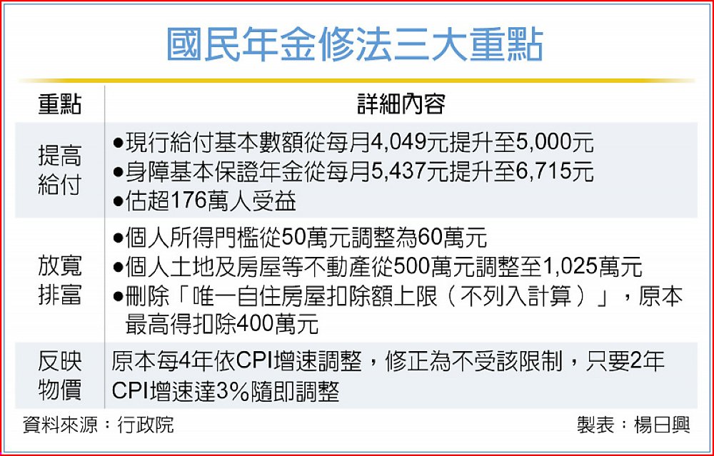 因應物價、經濟成長等狀況,政府近期持續盤點各項社會福利津貼,行政院22日拍板國民年金修正案,提升給付額度超2成至5,000元、預估超過176萬人受惠。此外調整排富標準,將個人年所得由50萬元調整為60萬元。