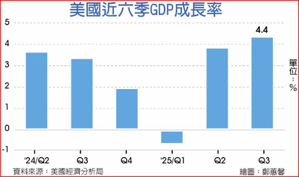 BEA在22日發布的最終值顯示,去年第三季(7至9月)美國實質GDP季增年率4.4%,較初估值上修0.1個百分點。官方指出,此次修正主要反映出口與投資表現優於原先預期,雖然消費支出略為下修,但整體仍支撐經濟成長。由於近期聯邦政府關門,因此最新數據是取代原定於去年12月公布的第三次估計。