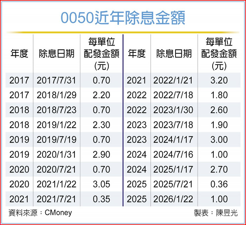 0050元大台灣50為市值型ETF,前五大成分股為台積電、鴻海、台達電、聯發科、日月光投控,在權值股領頭反攻下,帶動填息力道顯現。