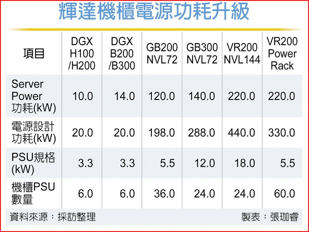 AI運算功耗快速攀升下,資料中心正迎來一場關鍵性的「電源革命」。隨GPU熱設計功耗(TDP)從H100的700W、B200的1,000W,一路推升至Rubin世代逾2,300W,傳統50V/54V低壓直流配電架構已逼近物理與效率極限。高壓直流電(HVDC)已從選配轉為標配,台廠台半(5425)、朋程(8255)與電源系統大廠密切配合,積極切入電源供應器(PSU)、AI機櫃等應用。