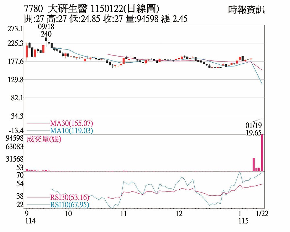 大研生醫*(7780)自19日起分拆後,流動率轉強,股價連4漲,外資、自營商藉機大舉賣超,其中外資連4賣已達1.7萬張,22日股價再拉漲停27元,成交量逾9.4萬張,並應證交所要求公告2025年12月自結稅後純益3,600萬元、每股純益0.44元。