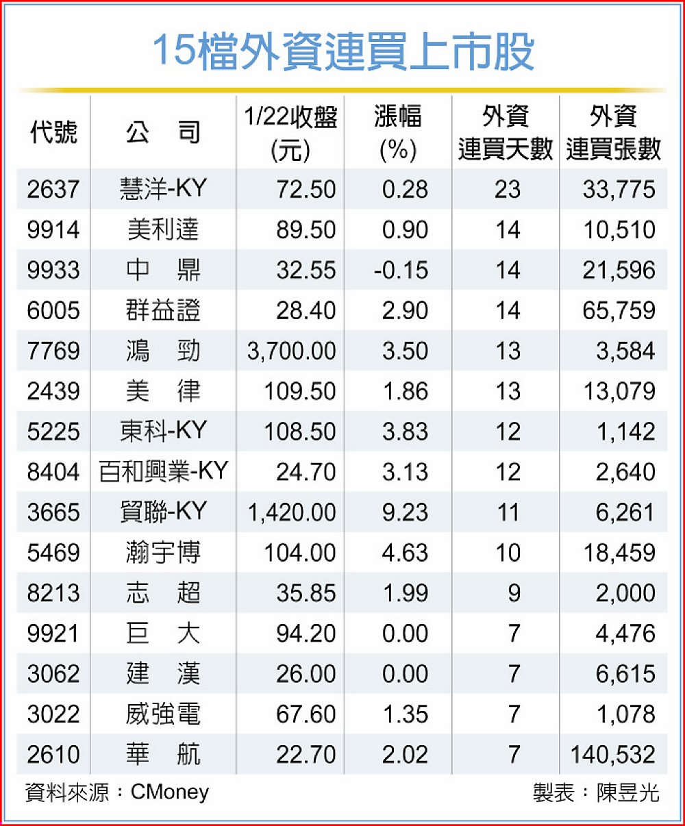 根據CMoney統計,獲外資連續買超七個交易日以上,且累計買超張數超過千張的上市股,包括慧洋-KY、美利達、中鼎、群益證、鴻勁、美律、東科-KY、百和興業-KY、貿聯-KY、瀚宇博、志超、巨大、建漢、威強電、華航等15檔,成為盤面關注焦點。