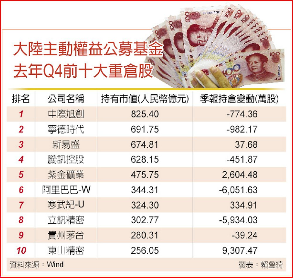 大陸各機構陸續公布2025年第四季季報,根據Wind統計,大陸光通訊模組龍頭、輝達供應商中際旭創,已取代長期占據主動權益基金重倉榜首的寧德時代,以人民幣(下同)820.4億元的持倉市值登頂。此外,先前受市場追捧的工業富聯、中芯國際已退出持倉前十名。