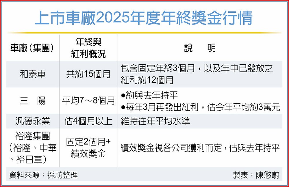 2025年車市儘管面臨雙稅(關稅、貨物稅)亂流重創,但車廠續發出高額年終獎金,其中車業龍頭和泰汽車最快本周發出年終獎金,加計已經入帳的紅利,合計2025年度將高達15個月水準。三陽工業則將維持與前一年度持平的7~8個月年終獎金。