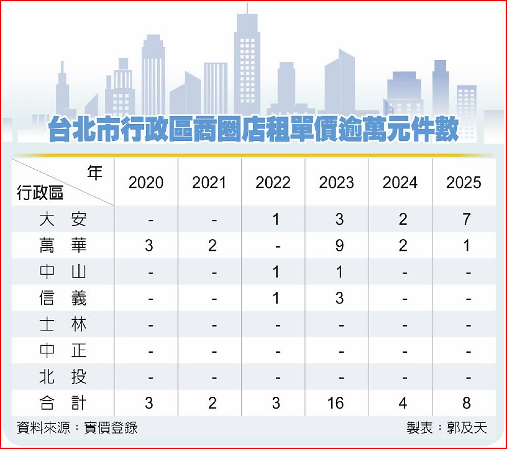 統計顯示,2018年以前,台北市各商圈店面租金單價站上萬元百花齊放,其中2013~2015年間東區商圈每年都有十餘件租金逾萬元的租案。不過隨觀光市場低迷、疫情因素使店面市場租金行情低迷,直至疫後人潮回流,西門町商圈首先迎來回升,走入「失落十年」的東區,終於也在2025年實價租案回升至十年前的表現。