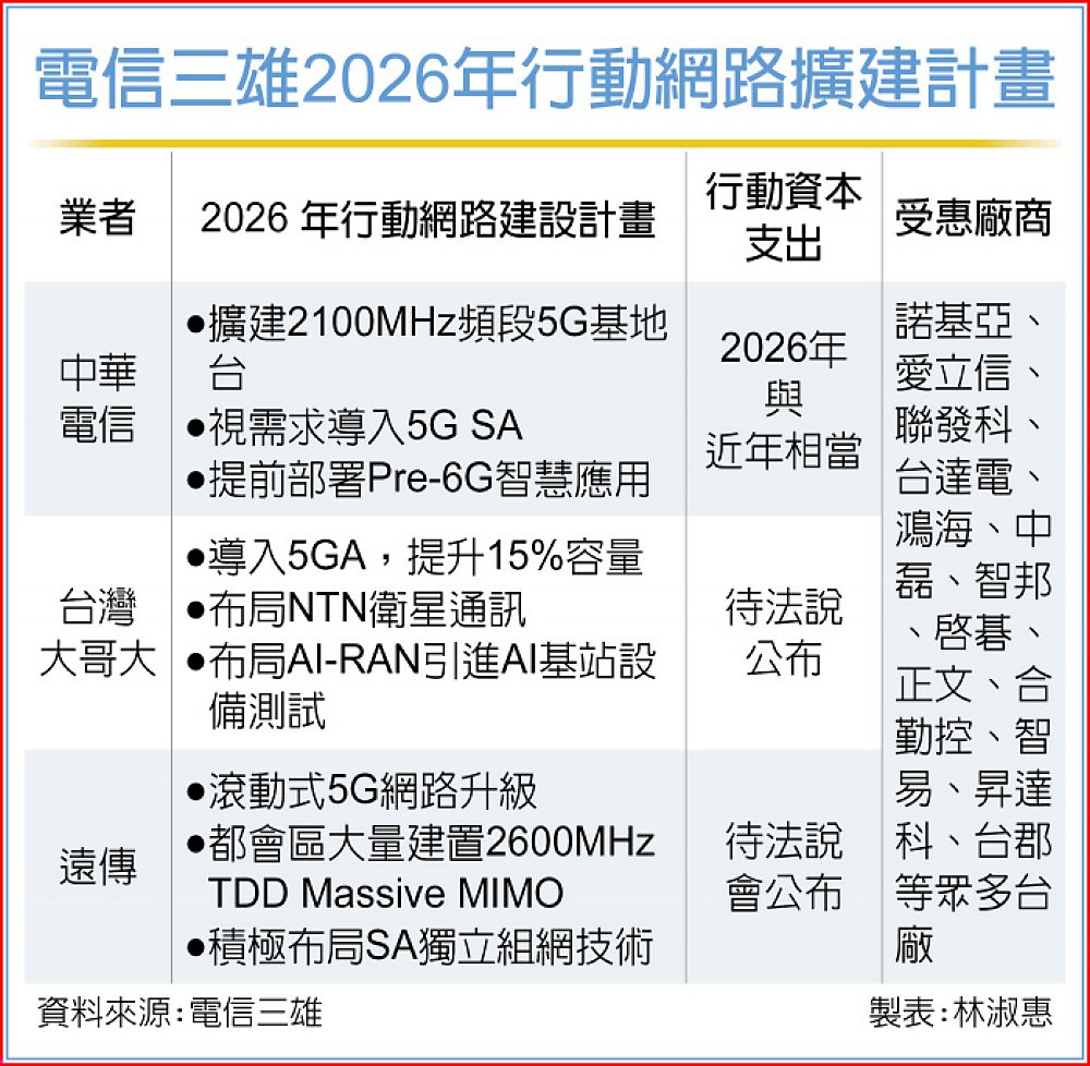 中華電信近三年行動資本支出約83.8億元至111.5億元。中華電信表示,2026年行動網路建設支出與近年相當,台灣大及遠傳強調,2026年資本支出待法說會公布。惟法人推估,電信三雄2026年行動網路建設,可望釋出約250億元的採購商機,諾基亞、愛立信等設備廠受惠最大,而兩大廠長期合作夥伴聯發科、台達電、鴻海、中磊、智邦、啟碁、正文、合勤控、智易、昇達科、台郡等台系業者亦將雨露均霑。