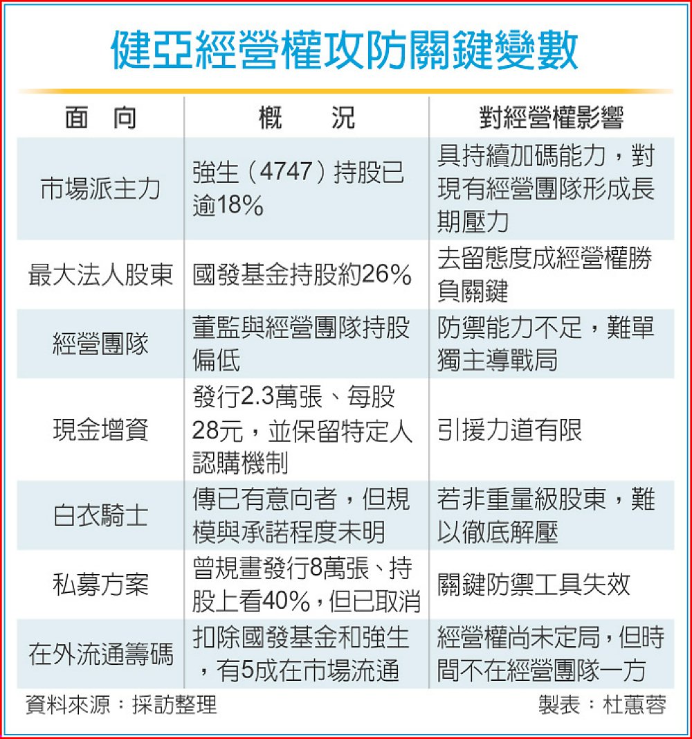 然而,30多年來健亞年營收多停留在約5億元水準,股權結構長期分散,董監持股偏低,加上股價未能充分反映公司價值,使其屢成市場覬覦標的。早在20年前,健喬(4114)即曾攜手國發基金意圖入主未果;2025年9月健喬再度發動公開收購,但最終因持股未達4%宣告失敗。
