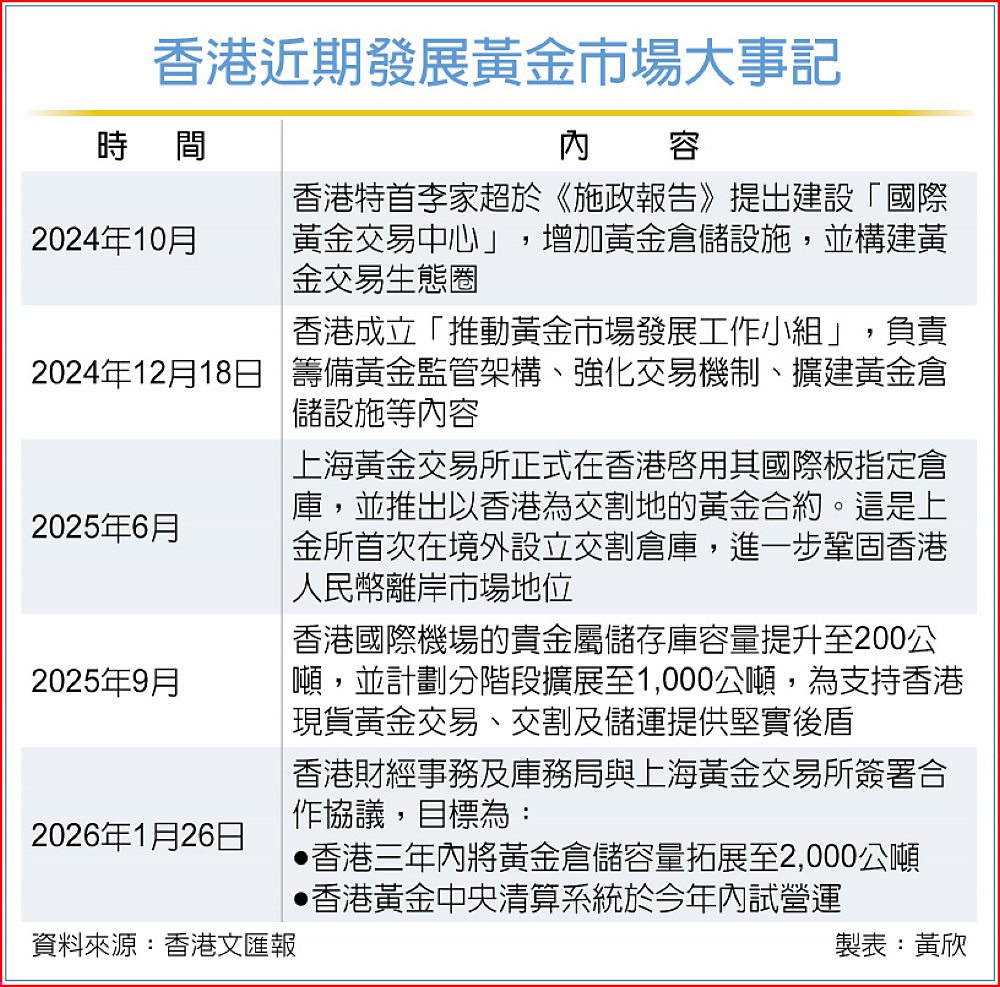 李家超在2024年10月的「施政報告」中提出建設國際黃金交易中心,擬增加黃金倉儲設施,並建構黃金交易生態圈,26日終於邁出重要一步,目標要讓香港成為亞洲甚至全球的黃金倉儲及交割中心。