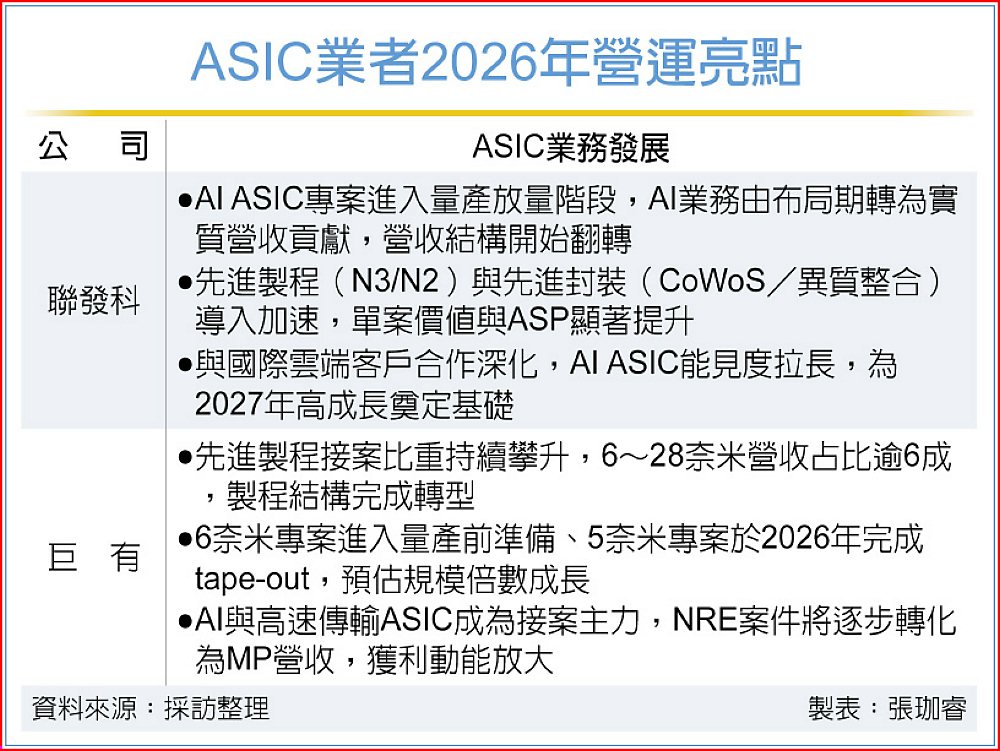AI算力競賽全面升溫,雲端大廠加速自研晶片,ASIC已從配角躍升為AI基建核心。在晶片迭代週期明顯縮短、先進製程與封裝門檻快速墊高之際,台系ASIC設計廠迎來關鍵卡位期。繼創意、世芯搶進國際CSP供應鏈後,聯發科近期再獲外資點名,今年AI ASIC貢獻將顯著放大,正式由AI配角晉升為關鍵戰力。此外,巨有科技亦成功跨越成熟製程天花板,接案動能加速轉向6奈米以下,並啟動5奈米專案,台系ASIC供應鏈整體能見度同步升溫。