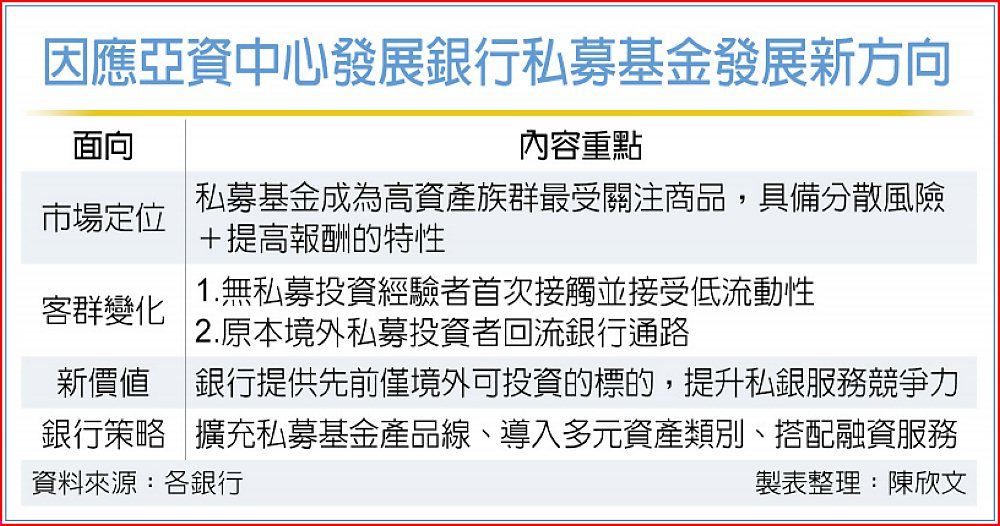 多家銀行配合政策進駐高雄專區後展開搶攻高資產族群攻略,銀行業者表示,試辦至今具特色的私募基金最受到關注,甚至有不少客戶主動詢問,因此相當看好未來私募基金在財管市場中的成長空間,今年起將持續擴展私募市場產品線來滿足高資產族群需求。