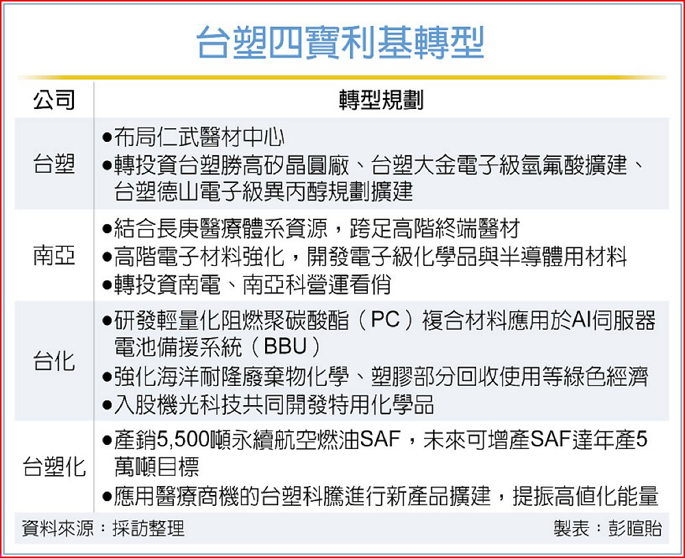 石化產業產能過剩壓力仍待去化,台塑四寶加速推動產品差異、高質化轉型,力求經營體質強化,除台塑、南亞、台化2025年差別化產品合計占比提升至52.8%,擴大綠色經濟,強化、開發醫療及電子、半導體應用,成為部署焦點。