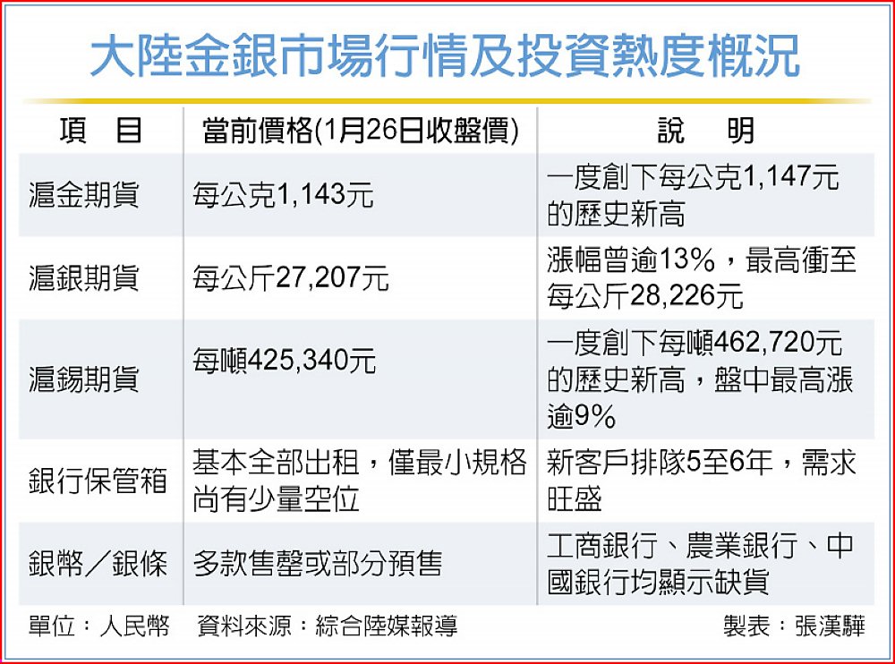 國際貴金屬行情持續狂飆,大陸金銀價格同步刷新歷史高點,帶動實體投資、金融商品與期貨市場全面升溫。