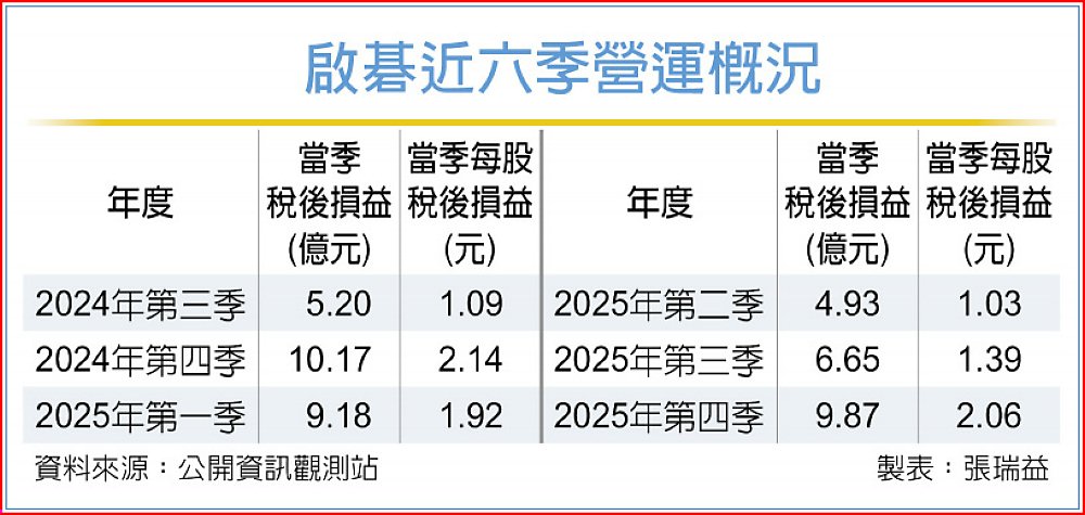 累計2025年全年,啟碁合併營收達1,102.51億元,與2024年的1,102.13億元幾乎持平,年增幅約0.03%;不過全年稅前盈餘38.54億元,較2024年減少約9.1%,稅後純益30.63億元,亦較2024年的34.51億元下滑約11.2%,全年每股稅後純益(EPS)為6.41元,較前一年的7.26元減少約11.7%。