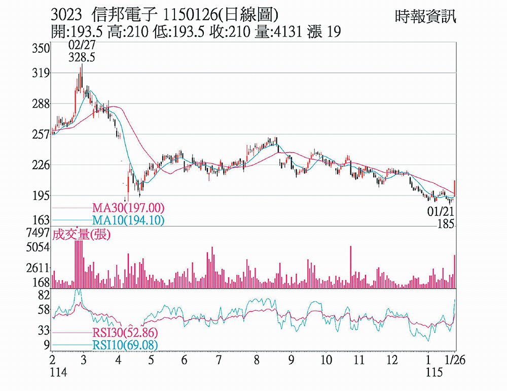 信邦(3023)股價今年以來一度觸及185元波段低點,籌碼歷經整理過後,26日股價跌深反彈,帶量拉出長紅K棒,股價強攻漲停板,以210元作收,創下2025年12月17日以來新高價位,並創下近期以來大量,儘管去年營運不如預期,不過法人預期,信邦2026年營運可望重啟成長。